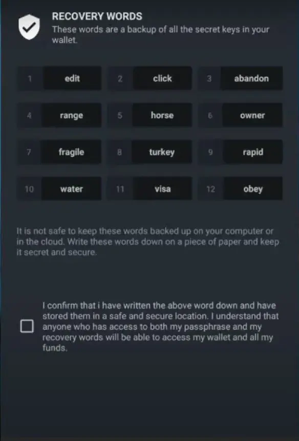 برنامه یک عبارت بازیابی 12 یا 24 کلمهای (Seed Phrase) ارائه میدهد.